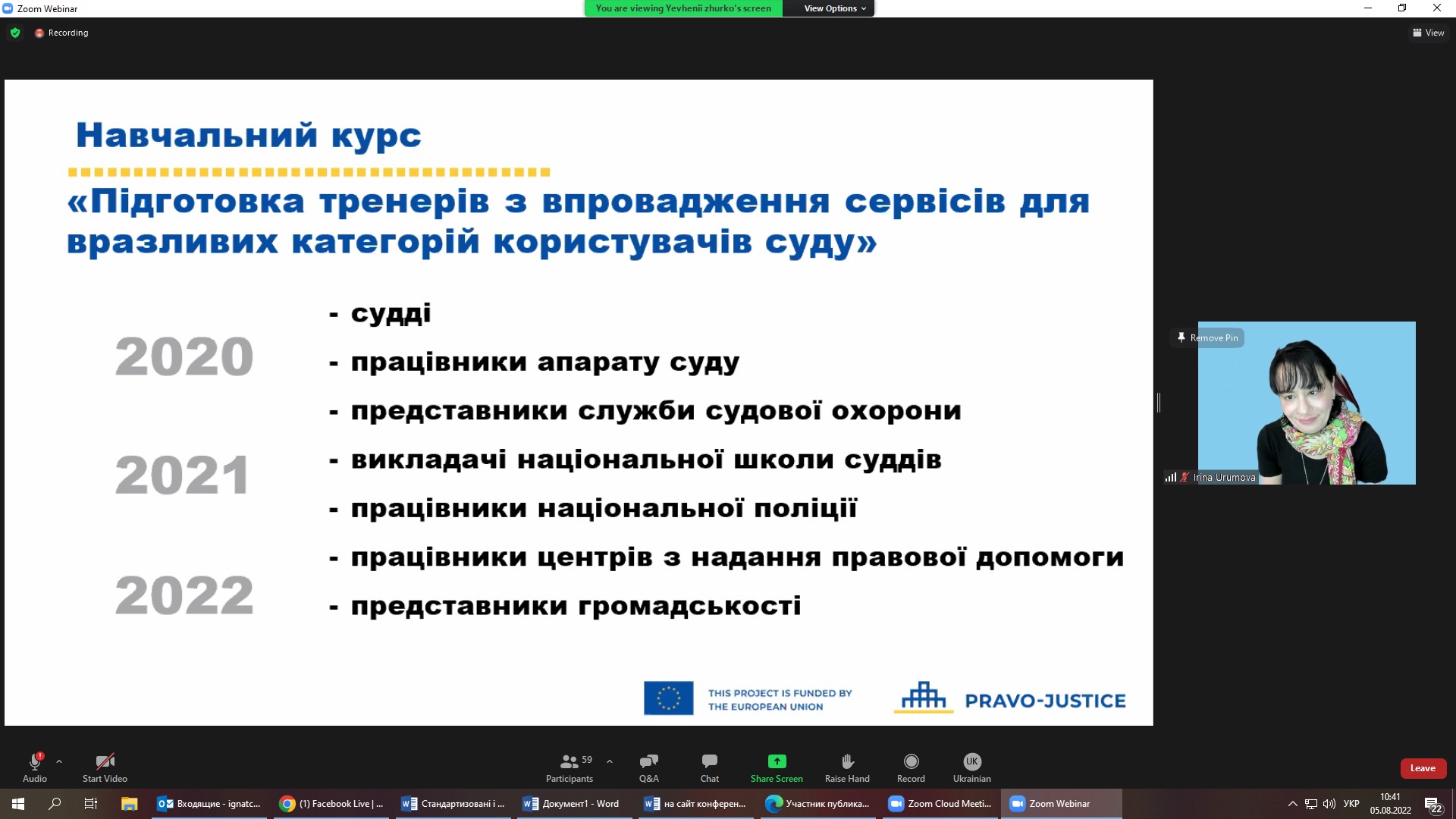 Міжнародна експертка Проєкту ЄС “Право-Justice ІІ” Іріна Урумова розповіла присутнім про адаптацію до реалій воєнного часу навчального курсу “Підготовка тренерів з впровадження сервісів для вразливих категорій користувачів суду“.