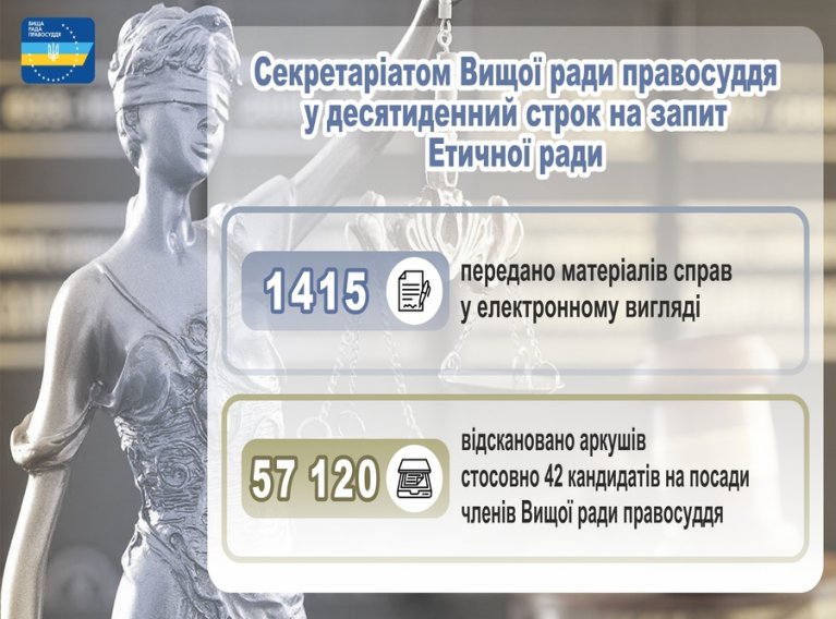 Зокрема, на запит Етичної ради в електронному вигляді передано 1415 матеріалів справ за скаргами, які надходили до ВРП у попередні роки стосовно 42 кандидатів на посаду члена Ради. У стислі строки співробітниками секретаріату відскановано 57 120 аркушів справ (дисциплінарні скарги, додатки до скарг, рішення, прийняті ВРП, її органами та членами Ради, тощо).