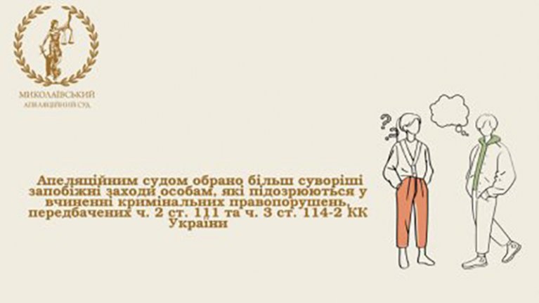 Миколаївським апеляційним судом перевірено законність та обґрунтованість рішень слідчих суддів суду першої інстанції ухвалених за результатами розгляду клопотань слідчих про продовження запобіжних заходів особам, які органами досудового розслідування підозрюються у вчиненні кримінальних правопорушень, передбачених ч. 2 ст. 111 та ч. 3 ст. 114-2 КК України.