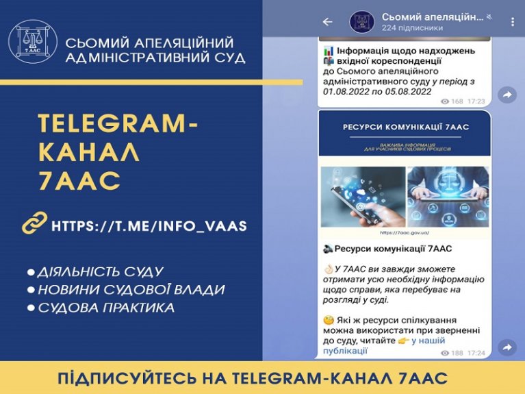 Сьомий апеляційний адміністративний суд нагадує, що інформацію про свою діяльність, а також важливу інформацію для учасників судових процесів, висвітлення аналізу судової практики та інші актуальні питання судової влади можна отримати через Telegram канал: https://t.me/Info_VAAS