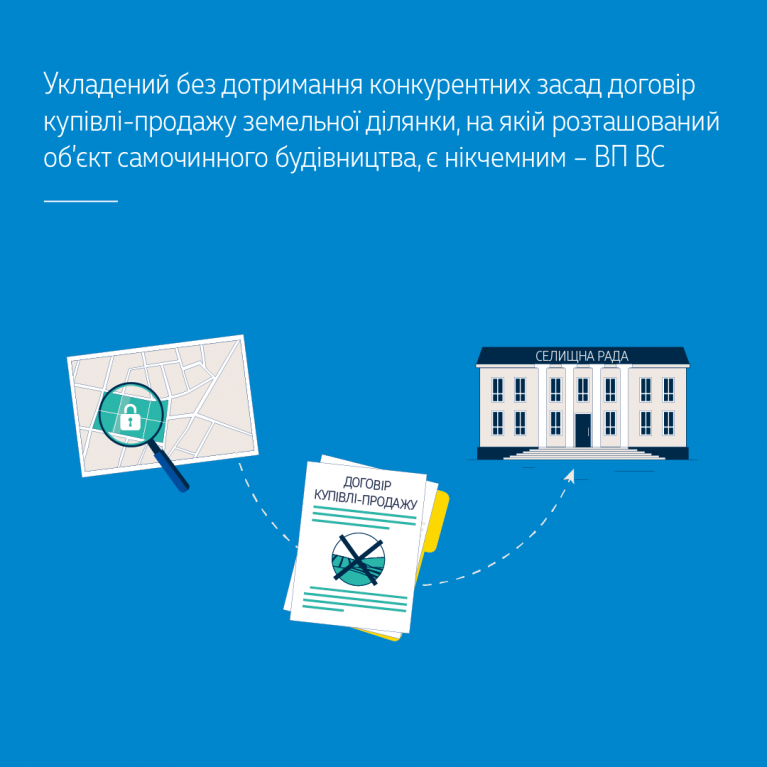 ВП ВС скасувала рішення судів попередніх інстанцій та ухвалила рішення про задоволення позову щодо повернення спірних земельних ділянок селищній раді, а в задоволенні вимоги про визнання недійсним спірного договору купівлі-продажу – відмовила.