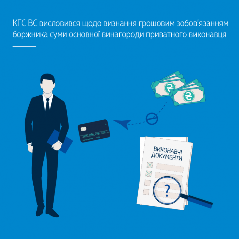 Тож КГС ВС підтримав раніше викладений у постанові від 2 червня 2021 року у справі № 910/11384/20 правовий висновок: оскільки норми Закону України від 2 червня 2016 року № 1404-ІІІ «Про виконавче провадження» зумовлюють виплату основної винагороди приватного виконавця задоволенням вимог стягувача, право вимоги приватного виконавця на виплату основної винагороди виникає в момент фактичного виконання виконавчого документа, одночасно з яким у боржника виникає і відповідне грошове зобов’язання в розумінні ст. 1 КУзПБ.
