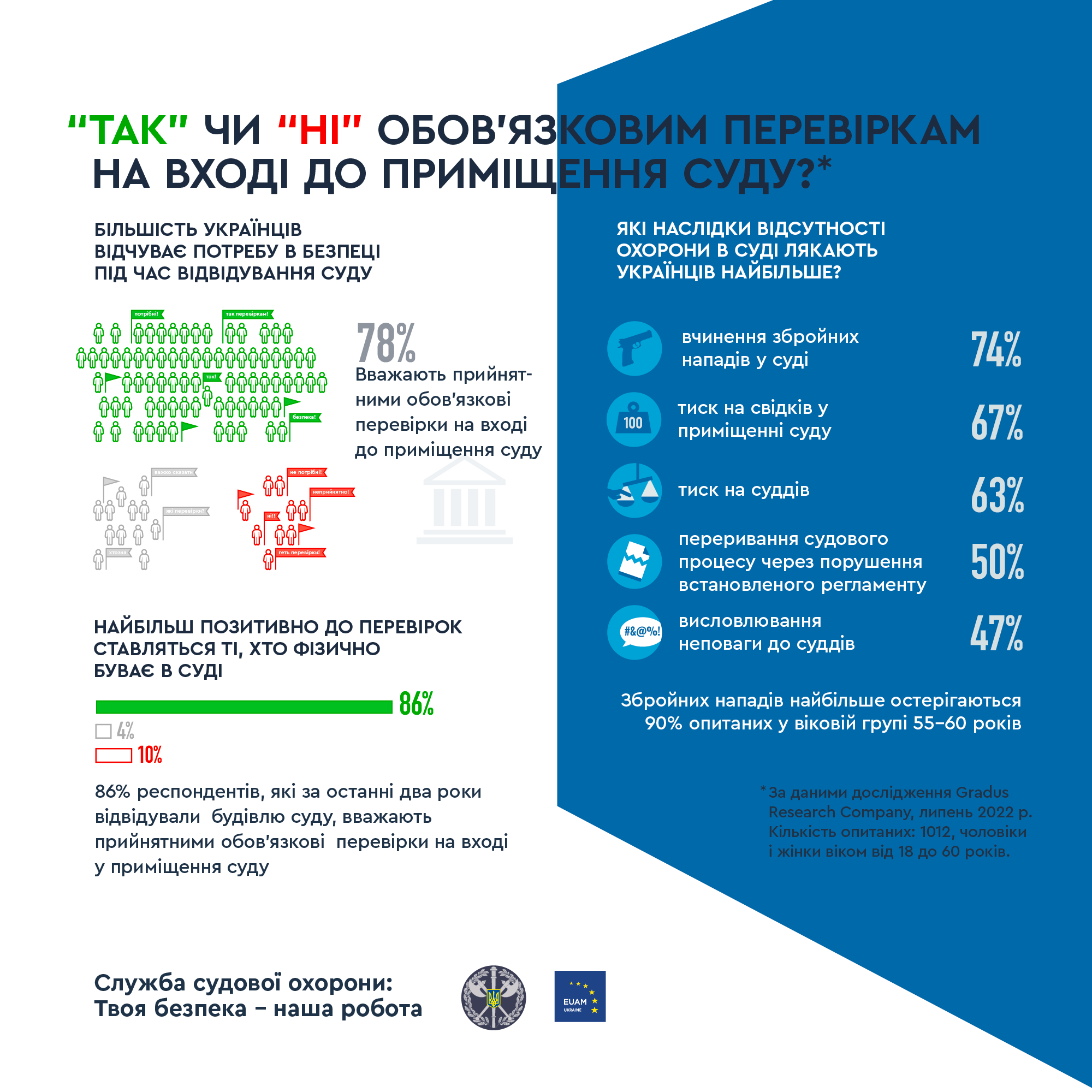 "Українці очікують почуватися в безпеці та захищено, коли б вони не зайшли до будівлі суду. Проте, до 74 %** побоюються ризику збройного нападу через недостатню безпеку в судах.