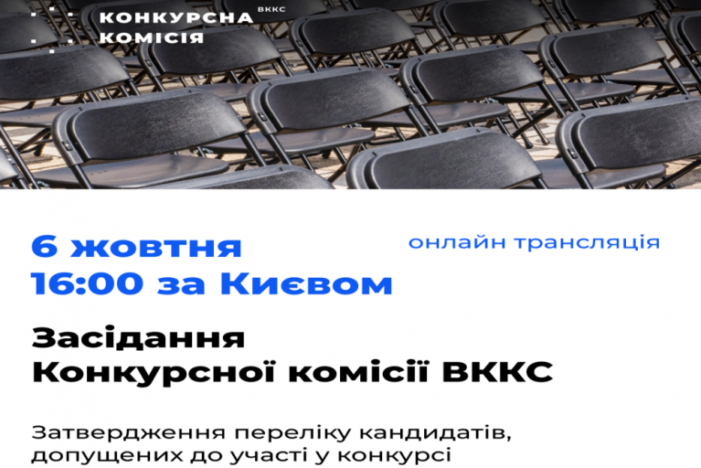 06 жовтня 2022 року о 16.00 відбудеться офіційне засідання Конкурсної комісії з добору кандидатів на посади членів Вищої кваліфікаційної комісії суддів України (Конкурсна комісія). Під час засідання буде затверджений перелік кандидатів, які за результатами перевірки документів на відповідність вимогам Закону України «Про судоустрій та статус суддів» допущені до участі у конкурсі. Офіційне засідання буде транслюватись в онлайн-режимі на офіційному сайті Вищої ради правосуддя, та офіційних каналах Конкурсної комісії – Facebook та YouTube українською та англійською мовами.