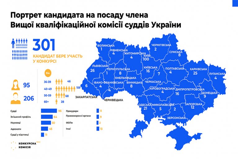 Зокрема, на 16 вакантних посад у Вищій кваліфікаційній комісії суддів України претендують 68% чоловіків (206 осіб) та 32% жінок (95 особи), з них 53% кандидатів – у віці від 40 до 49 років, 23% – від 50 до 59 років. З числа допущених до конкурсу кандидатів – 32% (96 осіб) – є суддями, 21% (64 особи) мають змішаний профіль професійної діяльності, 17% (50 осіб) – є науковцями, 15% (45 осіб) – є адвокатами, 3,6% (11 осіб) – судді у відставці, 3,6% (11 осіб) – прокурори, 3 %(9 осіб) – представники правоохоронних органів та 5% – мають інші спеціальності.