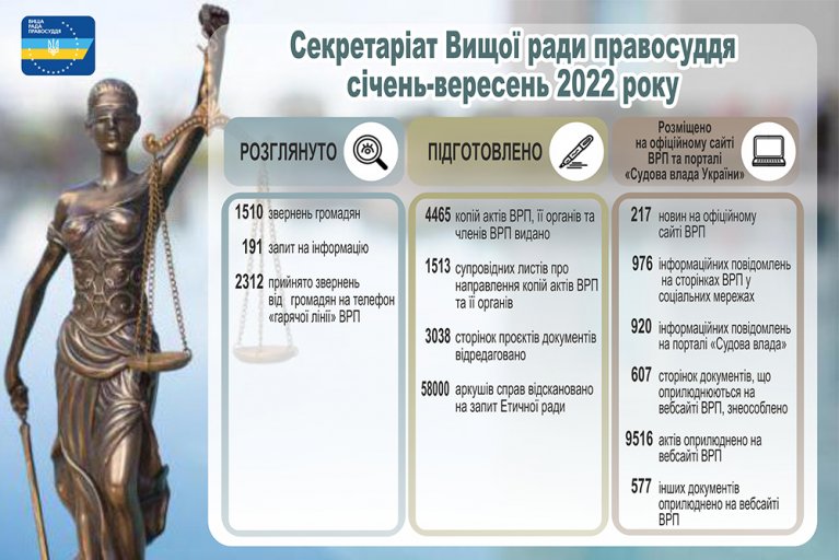 Протягом дев’яти місяців 2022 року секретаріатом Вищої ради правосуддя розглянуто 1510 звернень громадян та 191 запит на інформацію.