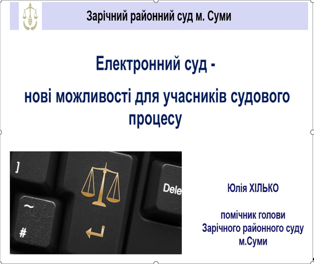 7 жовтня 2022 року помічник голови Зарічного районного суду м. Суми Юлія Хілько взяла участь в IV Міжнародній науково-практичній конференції. Тема її доповіді: Електронний суд – нові можливості для учасників судового процесу.