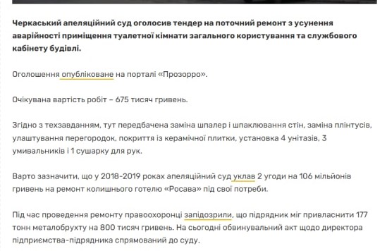 Черкаський апеляційний суд наголошує, що ця інформація не відповідає дійсності, так як Черкаський апеляційний суд не укладав зазначені у статті угоди на ремонт приміщення.