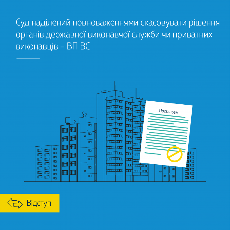 Велика Палата ВС зауважила, що в цій ситуації ефективним засобом, здатним відновити право стягувача на примусове виконання остаточного судового рішення, є скасування постанови, оскільки після її скасування виконавче провадження в силу ч. 1 ст. 41 Закону підлягає відновленню за постановою виконавця не пізніше наступного робочого дня з дня одержання виконавцем відповідного судового рішення.