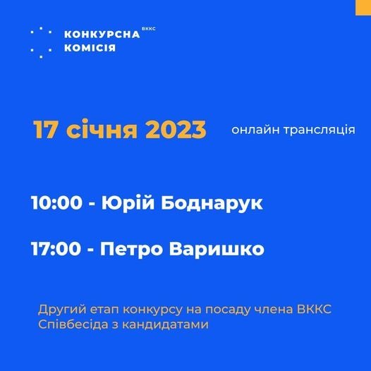 Сьогодні, 17 січня 2023 року, Конкурсна комісія з добору кандидатів на посаду члена Вищої кваліфікаційної комісії суддів України у другий день співбесід заслухає наступних кандидатів: