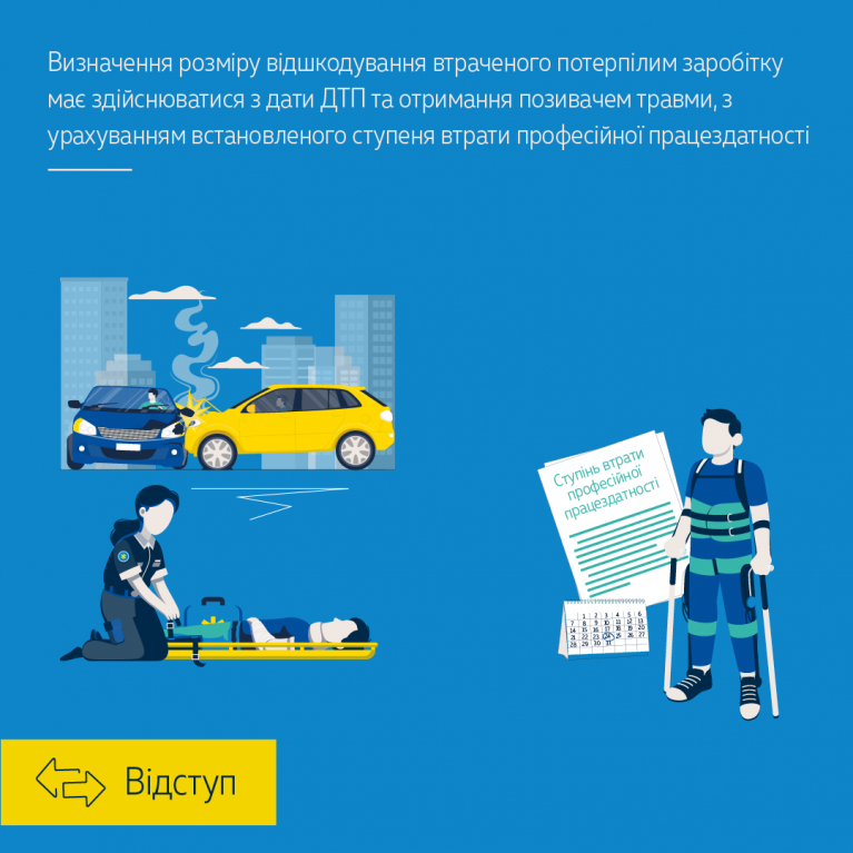 Висновком експерта від 26 листопада 2019 року встановлено, що ступінь втрати позивачем професійної працездатності становить 45 %. З огляду на обставини цієї справи ВП ВС констатувала, що визначення розміру відшкодування має здійснюватися з урахуванням встановленого ступеня втрати професійної працездатності та з моменту, коли в позивача з’явилося право на відповідне відшкодування, тобто з дати ДТП та отримання позивачем травми.