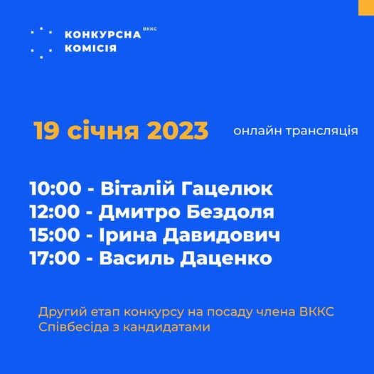 Конкурсна комісія з добору кандидатів на посаду члена Вищої кваліфікаційної комісії суддів України повідомляє про анонс співбесід на посаду члена Вища кваліфікаційна комісія суддів України, які відбудуться 19 січня: