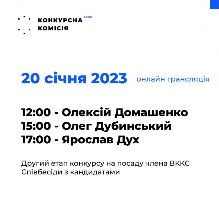 У п’ятницю, 20 січня, відбудуться співбесіди на посаду члена Вища кваліфікаційна комісія суддів України наступних кандидатів: