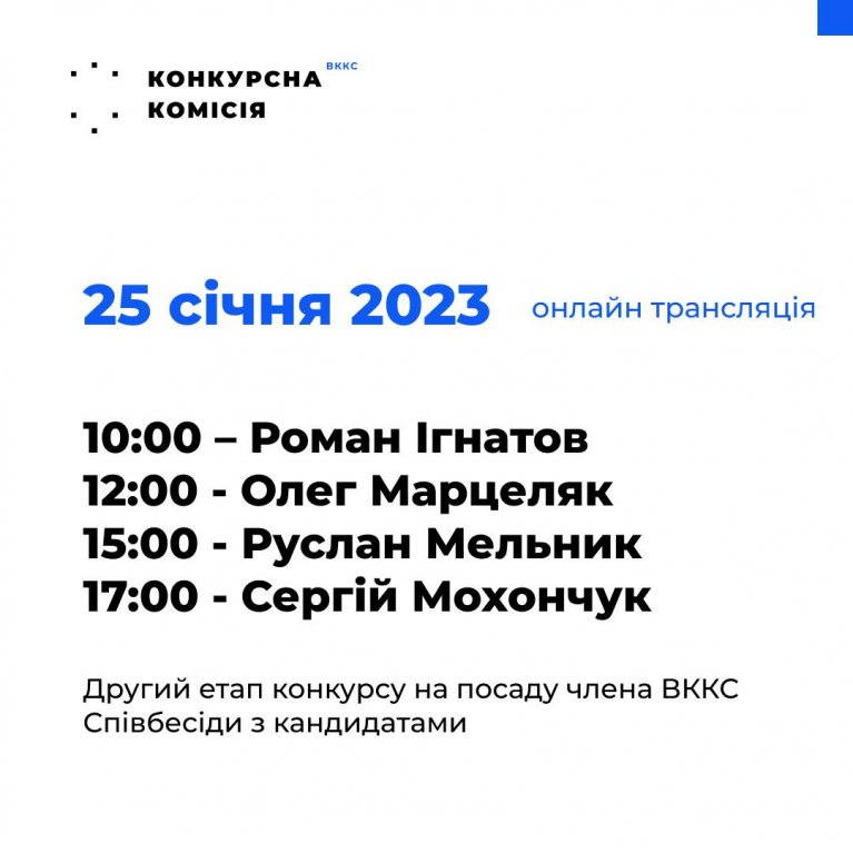 У середу, 25 січня, Конкурсна комісія проведе співбесіди з наступними кандидатами на посаду члена Вища кваліфікаційна комісія суддів України :