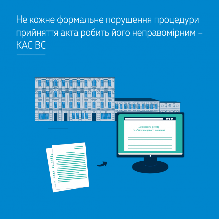 Крім цього, КАС ВС вказав на те, що суд першої інстанції призначив розгляд справи у спрощеному позовному провадженні, незважаючи на суспільний інтерес, статус зазначеної пам’ятки й на те, що збереження об’єктів культурної спадщини є пріоритетним конституційним завданням держави. Суд зауважив, що для розгляду справ, які через складність або інші обставини недоцільно розглядати у спрощеному позовному провадженні, призначене загальне позовне провадження.