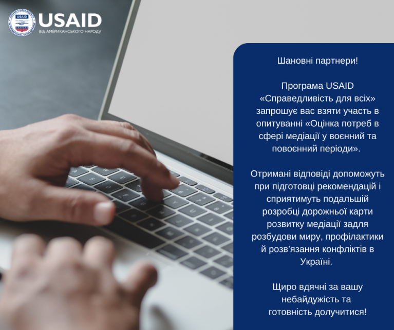 Програма USAID "Справедливість для всіх" запрошує своїх партнерів - суддів, працвників апарату судів, адвокатів, юристів, нотаріусів, працівників системи безоплатної правової допомоги, органів державної влади, місцевого самоврядування, правозахисних організацій, науковців, правників- юристів взяти участь в опитуванні "Оцінка потреб у сфері медіації у воєнний та повоєннийперіоди".