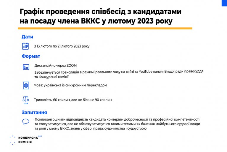 Конкурсна комісія з добору кандидатів на посаду члена Вищої кваліфікаційної комісії суддів України проводить другий етап конкурсу – співбесіду із кандидатами у січні та лютому 2023 року. Комісія склала графік проведення співбесід на 13 – 21 лютого 2023 року, який розміщено на сайті Вищої ради правосуддя.