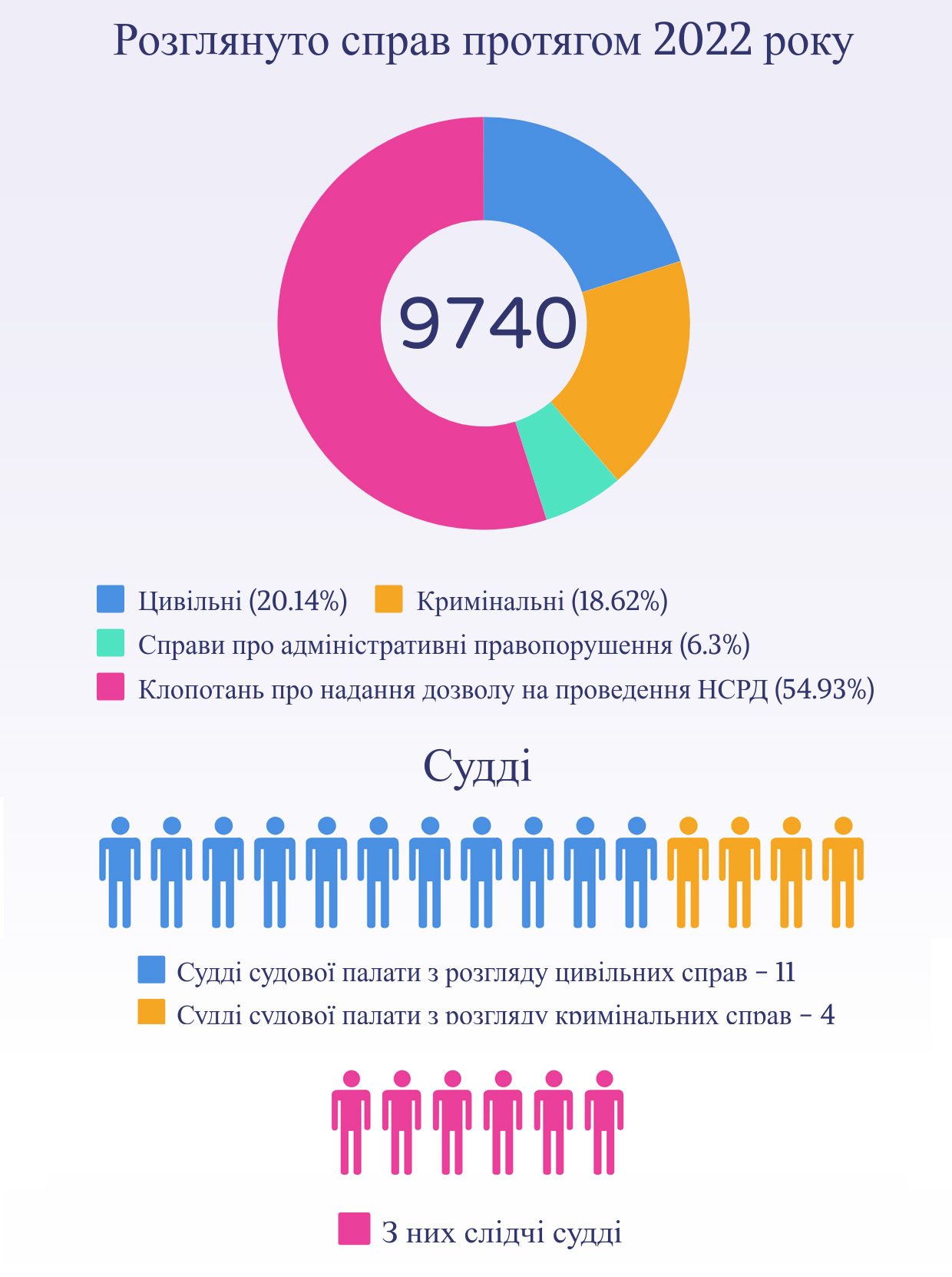 Тобто середня кількість розглянутих справ на одного суддю в 2022 році становить 649 справ. Окрім того, одним слідчим суддею було в середньому розглянуто 892 клопотання.