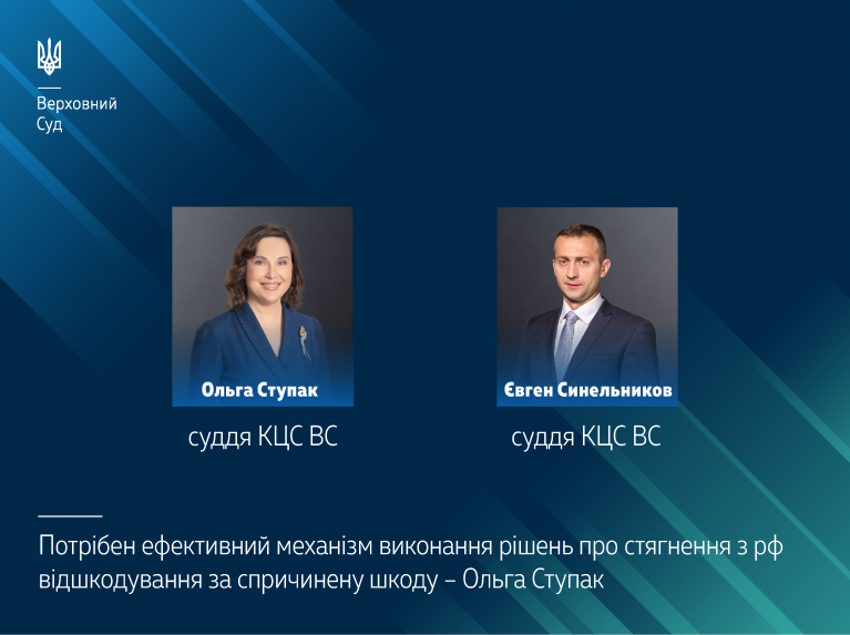 На цьому суддя Касаційного цивільного суду у складі Верховного Суду Ольга Ступак наголосила під час презентації Моніторингового звіту за 2022 рік щодо ефективності прийнятих нормативно-правових актів в Україні, підготовленого Міністерством юстиції України за підтримки проєкту ЄС «Право-Justice». 7 лютого 2023 року в рамках заходу обговорювалося питання виконання рішень національних судів, відповідачами в яких є російська федерація. Також участь в обговоренні взяв суддя КЦС ВС Євген Синельников.