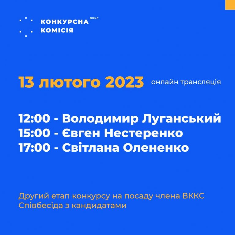 13 лютого 2023 року Конкурсна комісія з добору кандидатів на посаду члена Вищої кваліфікаційної комісії суддів України розпочне другу частину співбесід з кандидатами на посаду члена ВККС України.