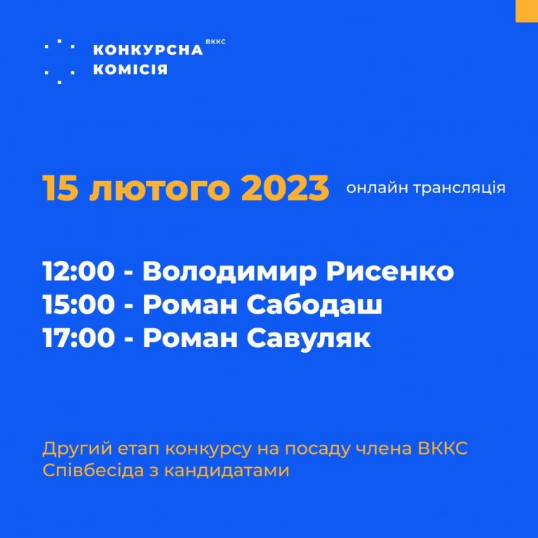 Сьогодні, 15 лютого 2023 року, Конкурсна комісія з добору кандидатів на посаду члена Вищої кваліфікаційної комісії суддів України проведе співбесіди на посаду члена ВККС України з трьома кандидатами: