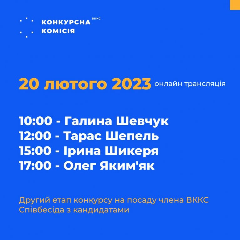 Сьогодні, 20 лютого 2023 року, Конкурсна комісія з добору кандидатів на посаду члена Вищої кваліфікаційної комісії суддів України продовжить свою роботу та проведе співбесіди з наступними кандидатами на посаду члена ВККС України: