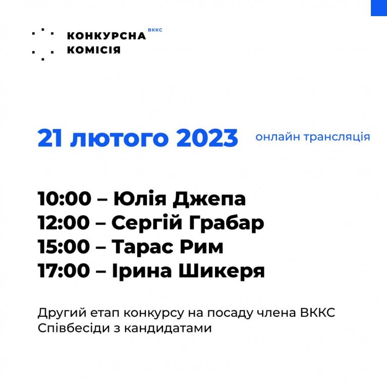 Сьогодні, 21 лютого 2023 року, Конкурсна комісія з добору кандидатів на посаду члена Вищої кваліфікаційної комісії суддів України завершує співбесіди на посаду члена ВККС України. В останній день публічних співбесід Конкурсна комісія зустрінеться з наступними кандидатами на посаду члена ВККС України:
