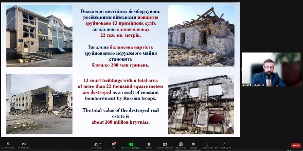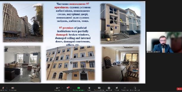 Сергій Чорнуцький у своїй презентації більш детально зупинився на історіях деяких судів, будівлі яких зруйновані або пошкоджені, зокрема: Харківського апеляційного суду, Господарського суду Миколаївської області, Краснолиманського, Вугледарського та Авдіївського міських судів Донецької області та інших.