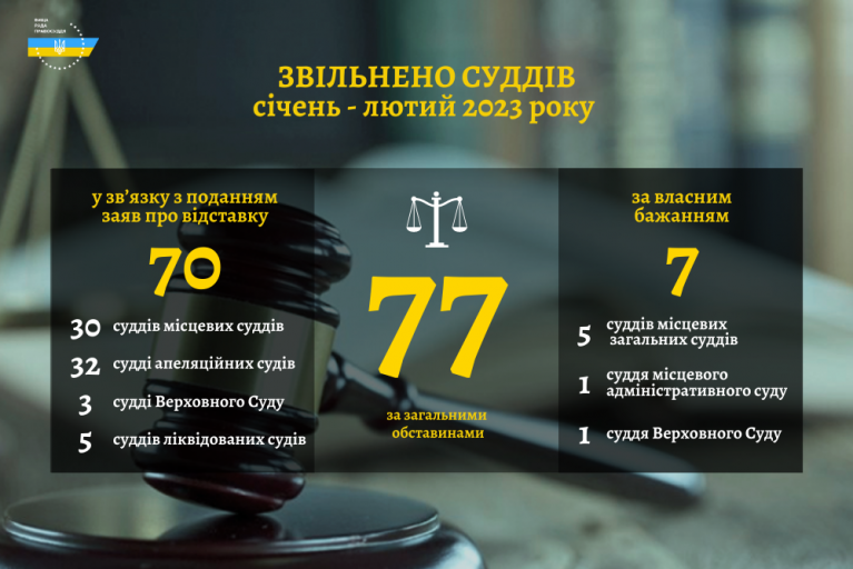 Протягом перших двох місяців 2023 року Вища рада правосуддя ухвалила рішення щодо звільнення 77 суддів з посад за загальними обставинами.