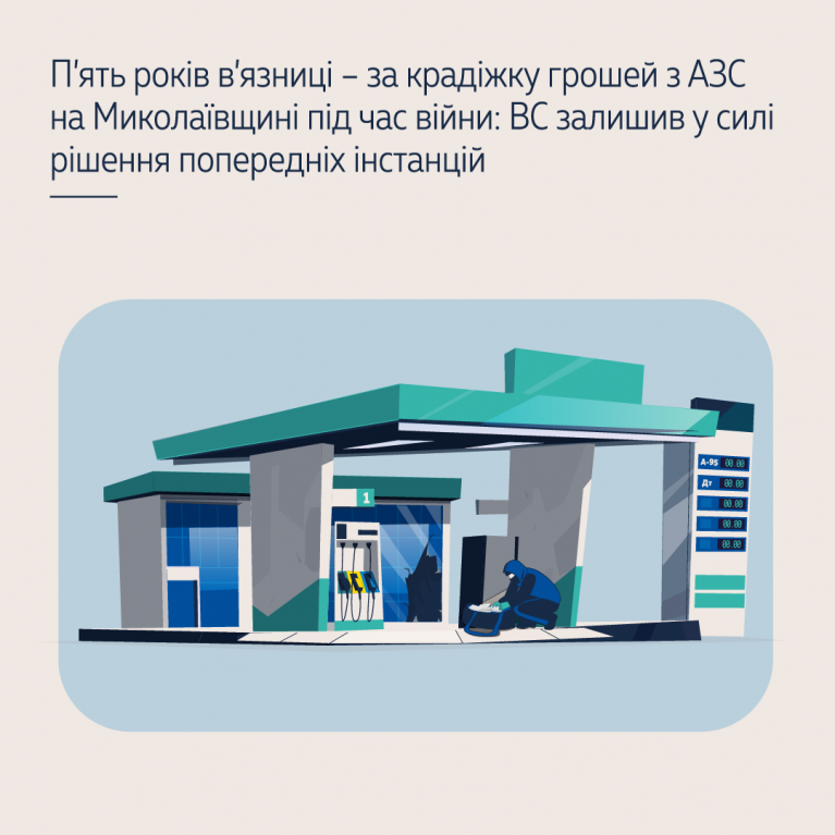 У березні 2022 року на Миколаївщині чоловік проник на територію автозаправної станції, яка не працювала через військові дії, і викрав понад 76 тис. грн із платіжного терміналу, розташованого в приміщенні АЗС. За вироком місцевого суду, який апеляційний суд залишив без змін, його було засуджено до покарання у вигляді позбавлення волі на строк 5 років за крадіжку, вчинену в умовах воєнного стану (ч. 4 ст. 185 КК України).