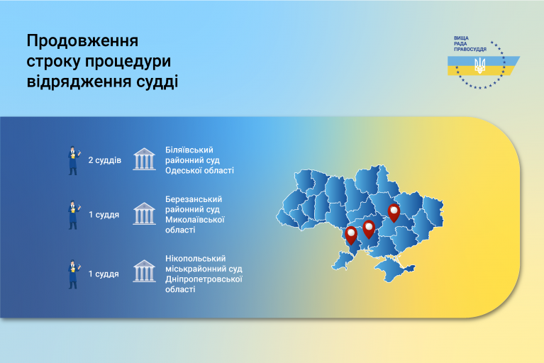 Вища рада правосуддя рішеннями від 20 квітня 2023 року № 395/0/15-23, № 396/0/15-23, № 398/0/15-23 продовжила строк надання суддями згоди на відрядження одного судді до Березанського районного суду Миколаївської області, двох суддів до Біляївського районного суду Одеської області, одного судді до Нікопольського міськрайонного суду Дніпропетровської області до 1 травня 2023 року.