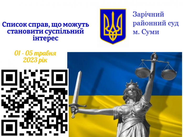 Зарічний районний суд м. Суми інформує про справи, що розглядатимуться 01.05.2023 – 05.05.2023 та можуть становити суспільний інтерес
