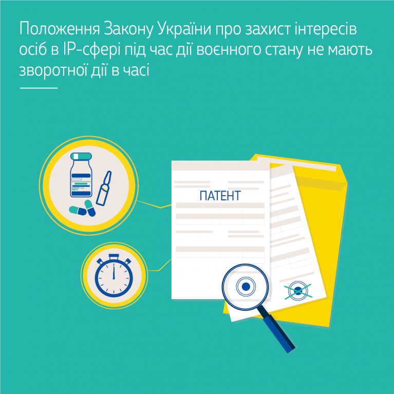 Верховний Суд констатував, що Закон України «Про захист інтересів осіб у сфері інтелектуальної власності під час дії воєнного стану, введеного у зв’язку із збройною агресією Російської Федерації проти України» (Закон) набув чинності 13 квітня 2022 року, а отже не підлягає застосуванню до спірних правовідносин, які виникли в лютому 2021 року й безпосередньо пов’язані з подачею ТОВ заяви на державну реєстрацію лікарського засобу та юридичними наслідками цієї дії.