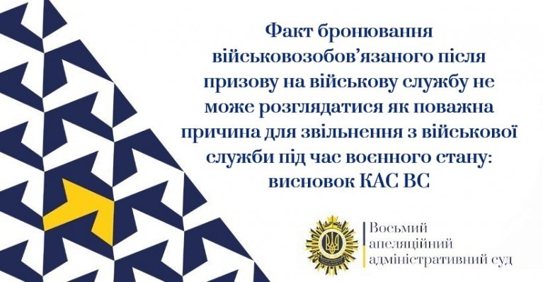 За результатами касаційного перегляду справи № 260/1851/22 колегія суддів Касаційного адміністративного суду у складі Верховного Суду (далі – КАС ВС) погодилася з висновком Восьмого ААС, що факт бронювання військовозобов`язаної особи після її призову на військову службу не може розглядатися як поважна причина для її звільнення з військової служби під час воєнного стану на підставі підпункту «г» пункту 2 частини четвертої статті 26 Закону України «Про військовий обов`язок і військову службу»