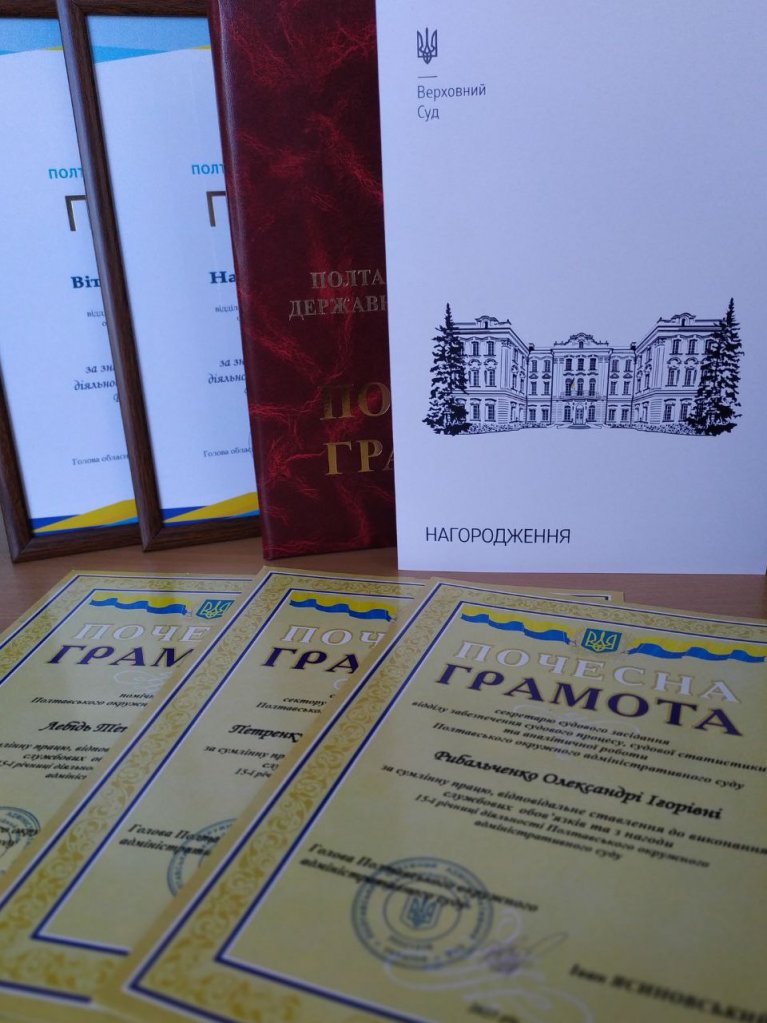 За сумлінну та бездоганну працю, зразкове виконання службових обов’язків та з нагоди Днів адміністративної юстиції України, до Дня Конституції України, працівники апарату суду, державні службовці та патронатної служби отримали відзнаки Верховного Суду, місцевих органів виконавчої влади, органів місцевого самоврядування та почесні грамоти керівництва суду.