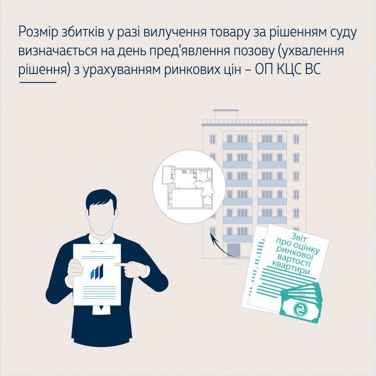 ОП КЦС ВС погодилася з апеляційним судом, що відповідальність за компенсацію коштів лежить на відповідачеві. А на доводи відповідача, що позивач купив квартиру за 150 тис. 353 грн, але просив відшкодувати більшу суму, ВС зауважив, що відповідно до ч. 3 ст. 623 ЦК України розмір збитків у разі вилучення товару за рішенням суду визначається з урахуванням ринкових цін, що існували в місці, де зобов'язання має бути виконане, на день пред'явлення позову, якщо інше не встановлено договором або законом, або на день ухвалення рішення суду, а не на день придбання майна.