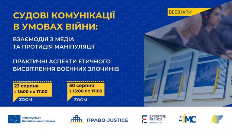 Запрошуємо на вебінари, присвячені судовим комунікаціям в умовах війни, зокрема особливостям взаємодії з медіа та протидії маніпуляціям, а також ролі інформації у війні та практичним аспектам етичного висвітлення воєнних злочинів.