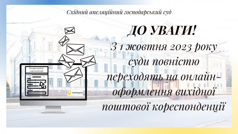 Східний апеляційний господарський суд нагадує, що з 1 жовтня 2023 року суди повністю переходять на онлайн-оформлення вихідної поштової кореспонденції, що, в свою чергу, передбачає автоматичне формування всіх згрупованих реєстрів поштових відправлень.