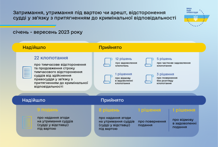 Загалом з початку року до ВРП надійшло 9 подань про надання згоди на утримання судді під вартою. Прийнято 1 рішення про повернення подання про надання згоди на утримання судді під вартою та 1 рішення про відмову у задоволенні подання про надання згоди на утримання судді під вартою за результатами розгляду подання, яке надійшло 21 червня 2022 року.