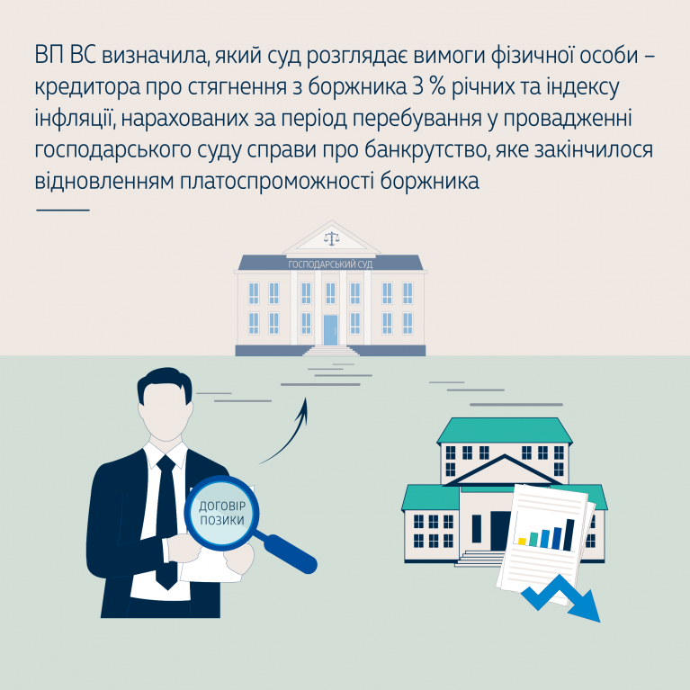ВП ВС визначила, який суд розглядає вимоги фізичної особи – кредитора про стягнення з боржника 3 % річних та індексу інфляції, нарахованих за період перебування у провадженні господарського суду справи про банкрутство, яке закінчилося відновленням платоспроможності боржника.