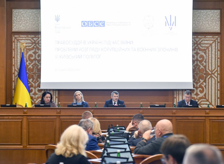 Як зауважив Посол, ОБСЄ відіграє важливу роль, надаючи допомогу та здійснюючи експертизу щодо обох аспектів цієї теми судочинства у справах, пов’язаних з корупцією, та у справах, пов’язаних з війною. Обидва ці аспекти стали великим викликом для української державної влади, особливо для судової системи. 3 огляду на це був спеціально розроблений відповідний проєкт Програми підтримки ОБСЄ для України для допомоги в розбудові спроможності Верховного Суду та вищих судів долати ці виклики.