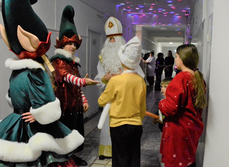 Маленьким пацієнтам відділення пластично-реконструктивної мікрохірургії НДСЛ «Охматдит» Святий Миколай з двома помічниками-ельфами приніс солодкі подарунки і фрукти. А також влаштував веселощі з іграми, цікавими завданнями й танцями.