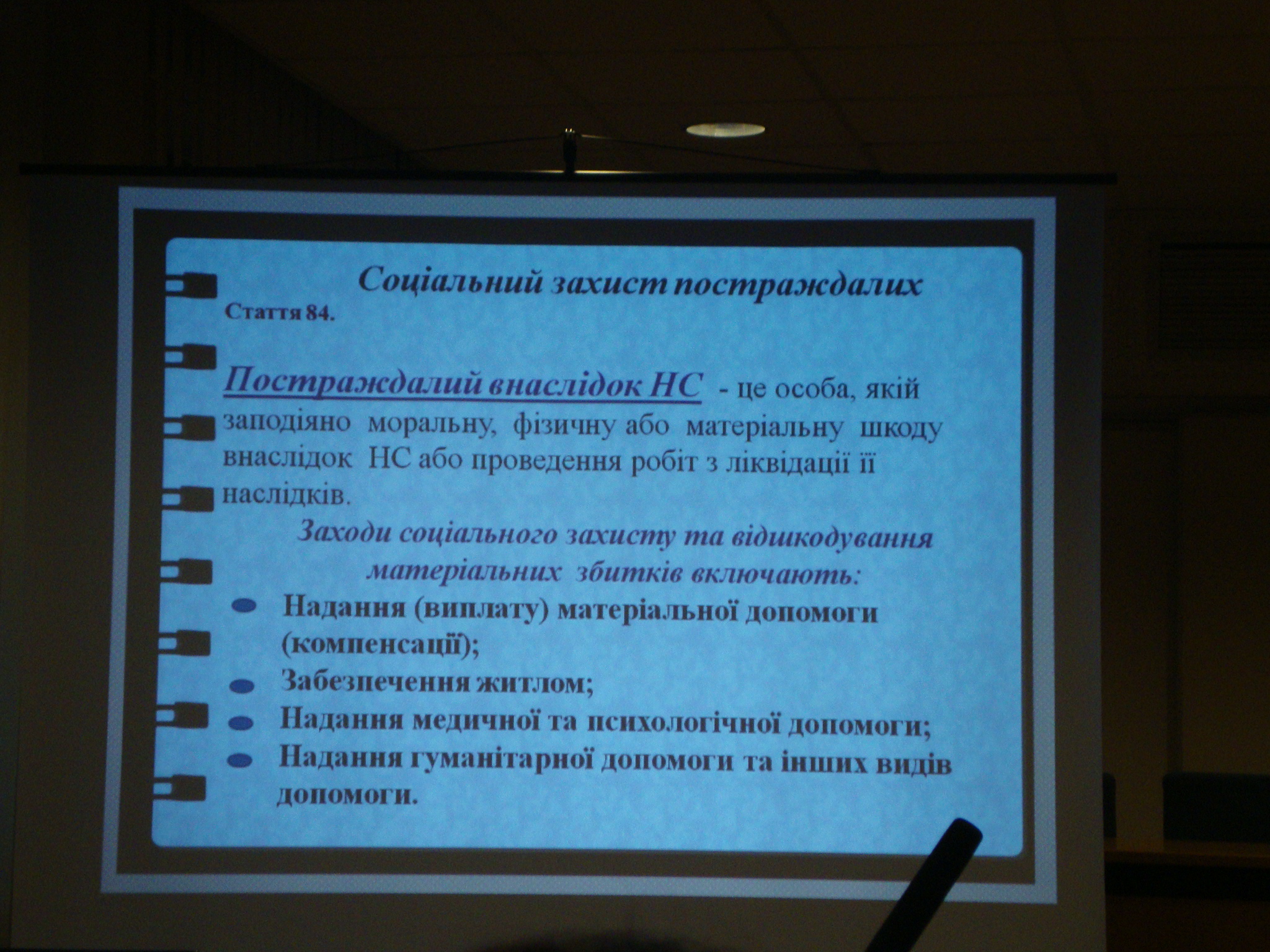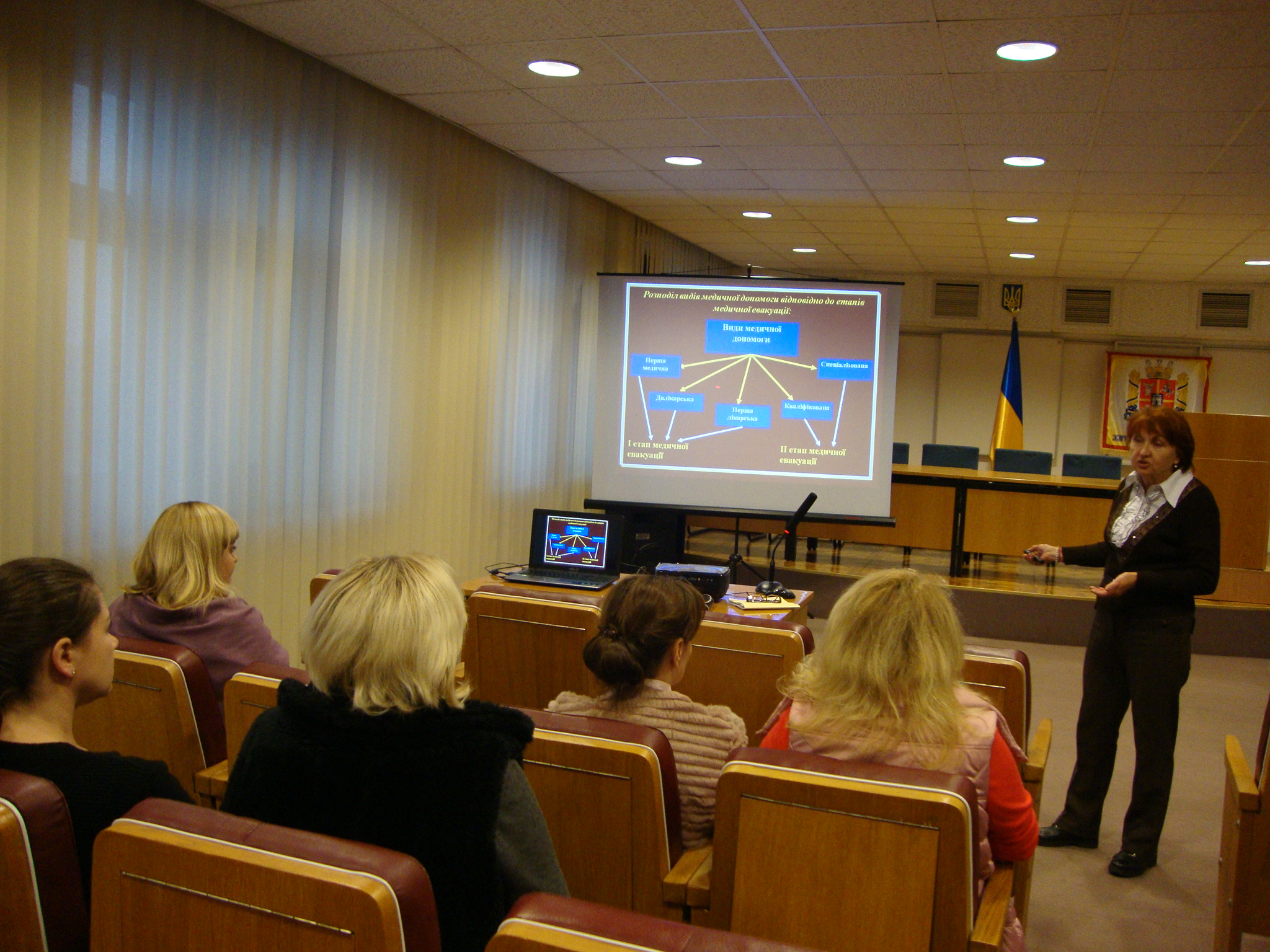 Пані Тетяна презентувала перед присутніми матеріали щодо основ цивільного захисту. Перед початком її доповіді присутні пройшли невеликий тест, який виявив їхні добрі знання з питання, що розглядалося. Далі викладач подала відомості про законодавчу та нормативну базу цивільного захисту. Висвітлила теми щодо поняття надзвичайної ситуації (далі – НС) та основних заходів у сфері захисту населення й територій від НС. Навела статистичні дані про кількість НС в Україні за 2017 рік: всього – 152, з них: 43 техногенних, 101 природна, 8 соціальних та 78 993 пожежі.