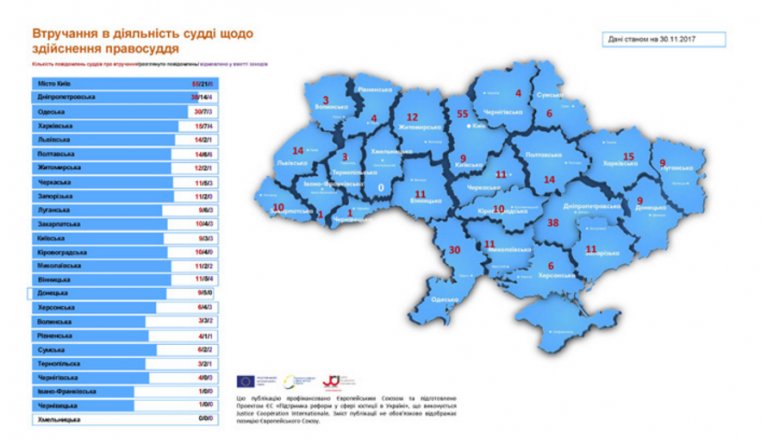 Наразі лідерами щодо  звернень є суди міста Києва (55 повідомлень), Дніпропетровська (38) та Одеська області (30).