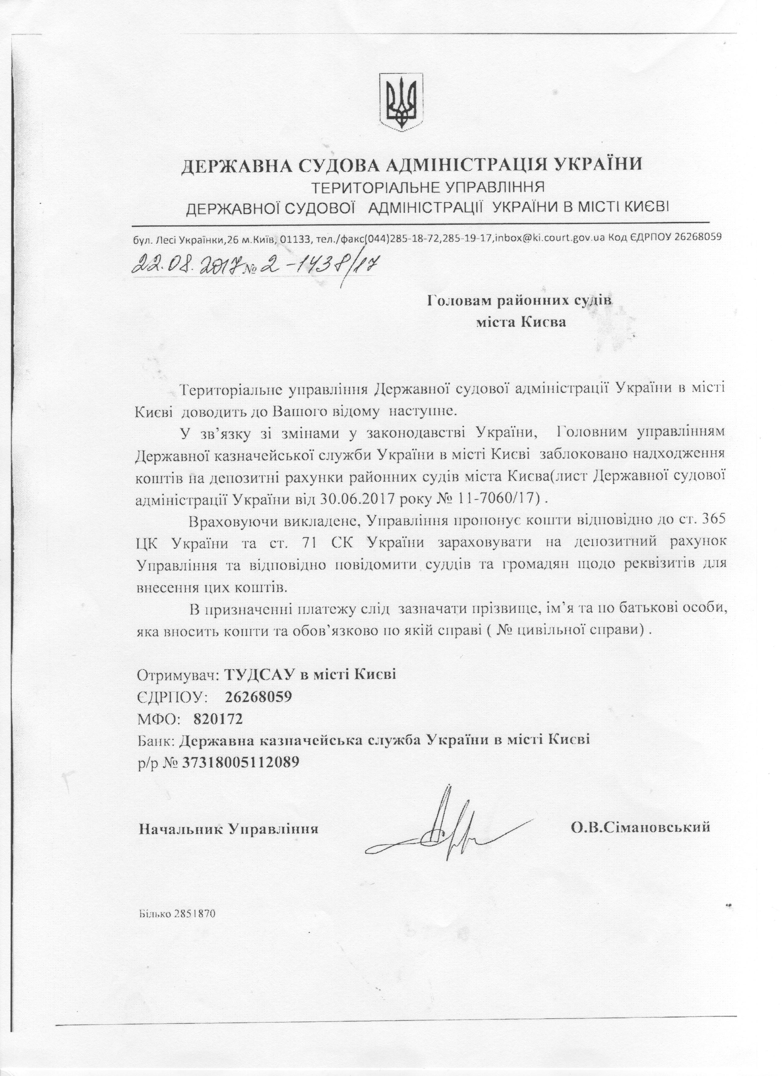 Відповідно до листа ТУ ДСА України в м.Києві від 22.08.2017 за №2-1438/17 доводимо до вашого відома наступні реквізити рахунку, на який Управління пропонує зараховувати кошти (згідно ст.365 ЦК України та ст.71 СК України) на депозитний рахунок Управління: