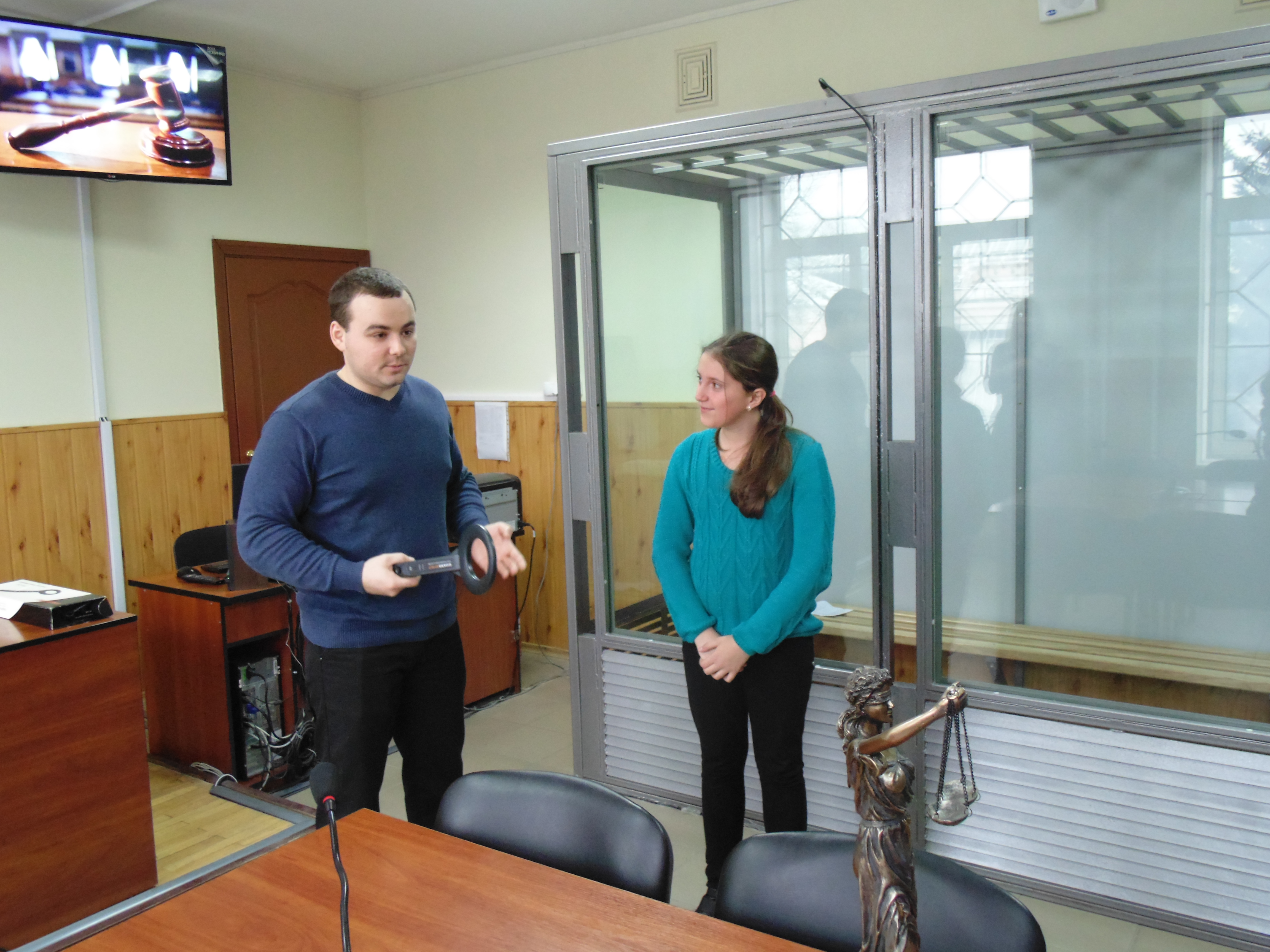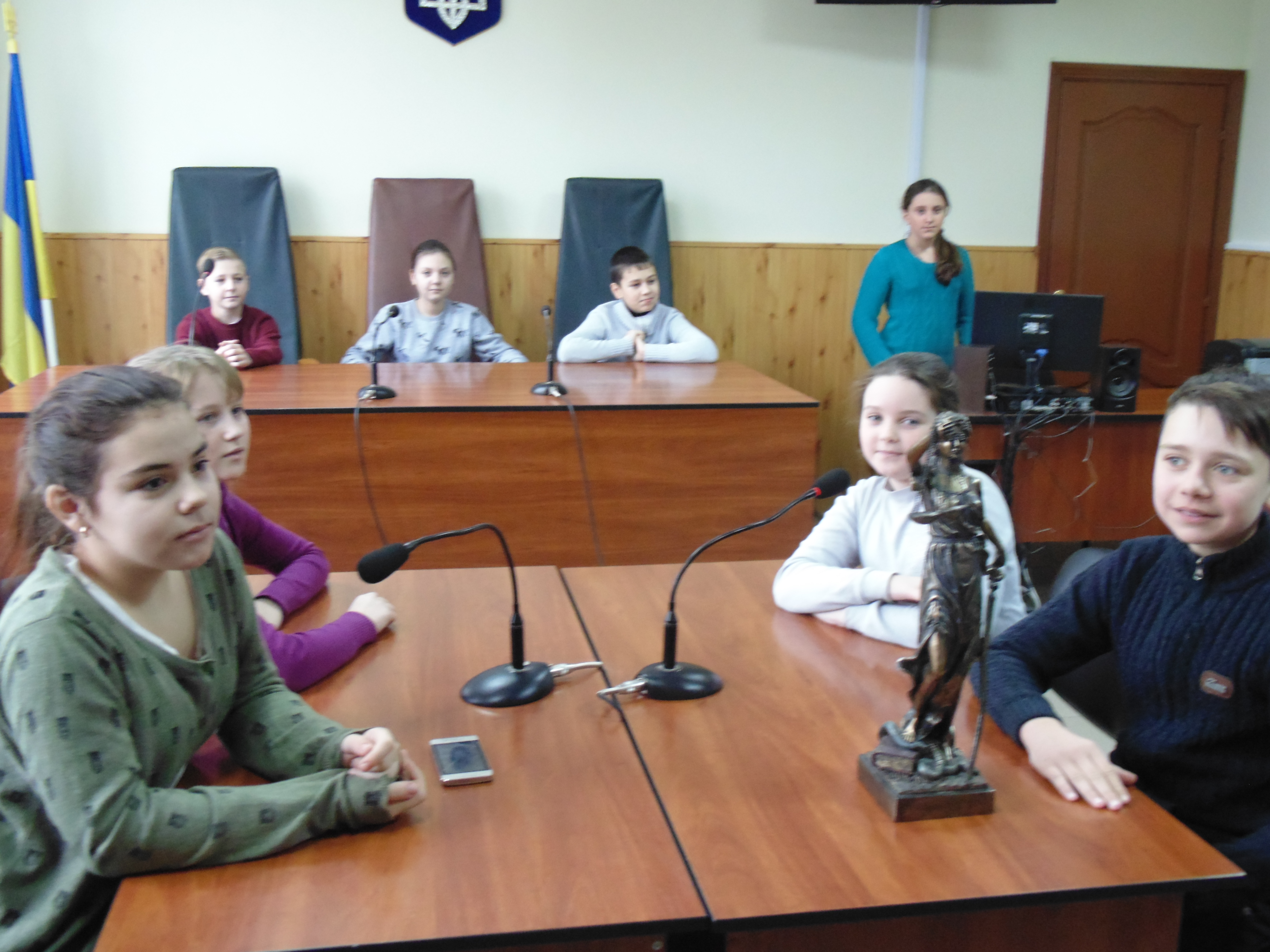Потім юних відвідувачів запросили до зали судових засідань. У формі діалогу із керівником апарату хлопцям та дівчатам розповідали які місця в залі займають судді, прокурори, адвокати, секретар судового засідання, а також підозрюваний чи обвинувачений. З’ясували, що учасники процесів дають покази за спеціальною трибуною.