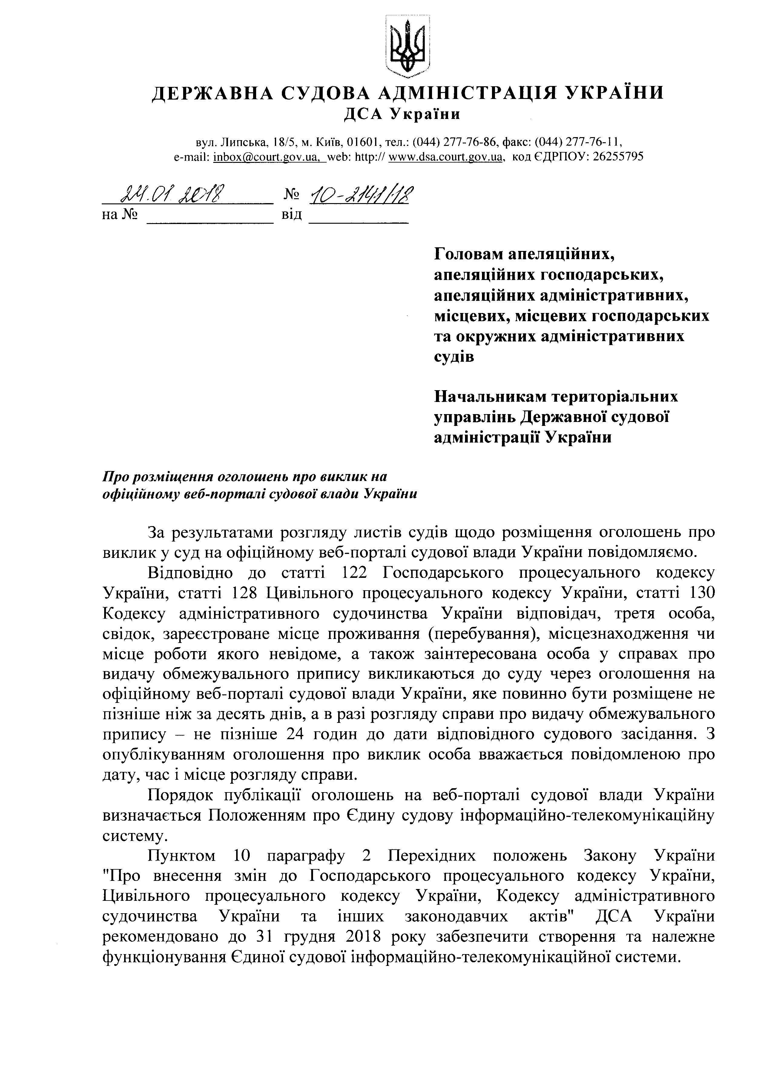 Дворічанський районний суд Харківської області оприлюднив лист ДСА України щодо розміщення оголошень про виклик до суду