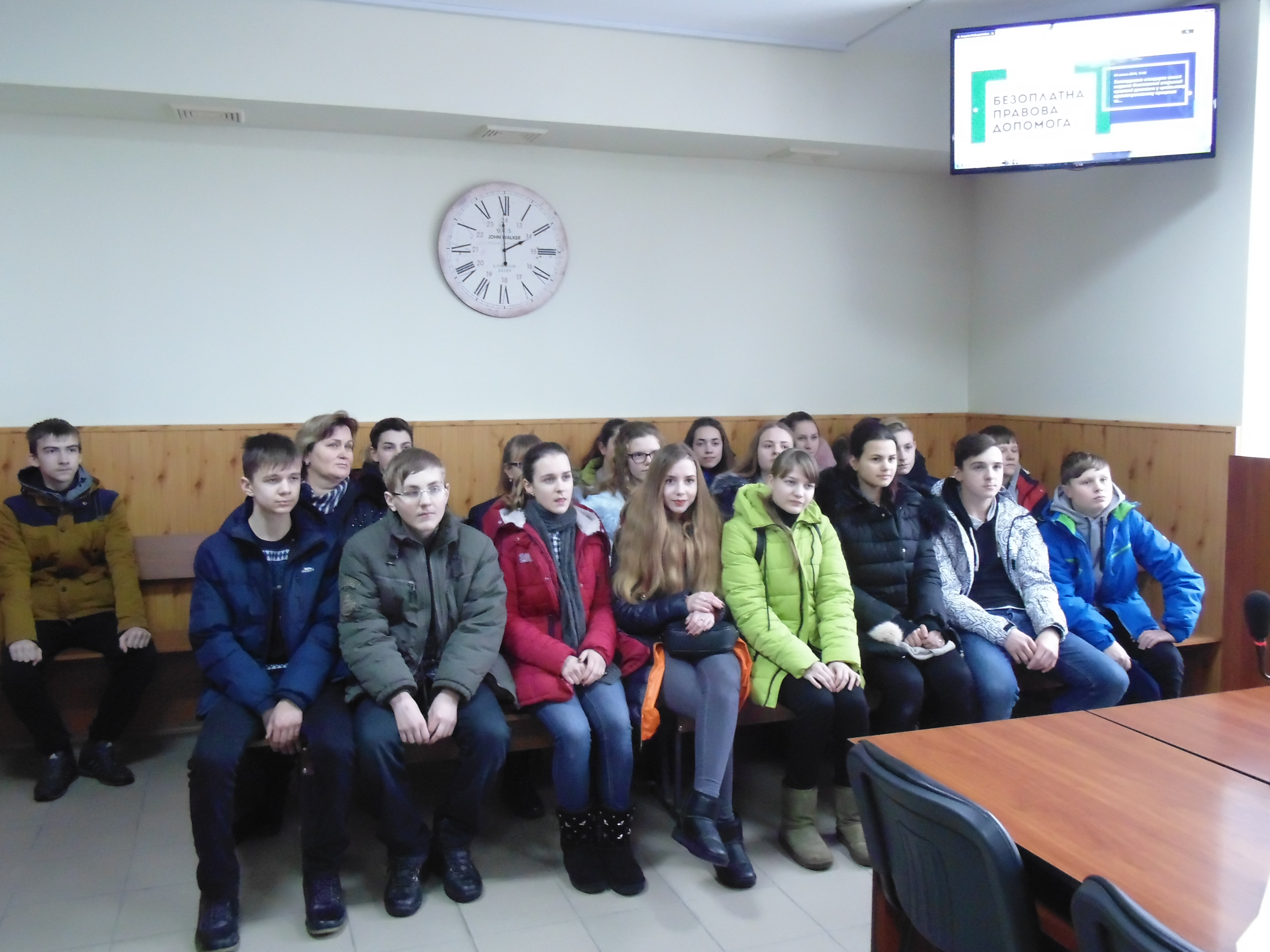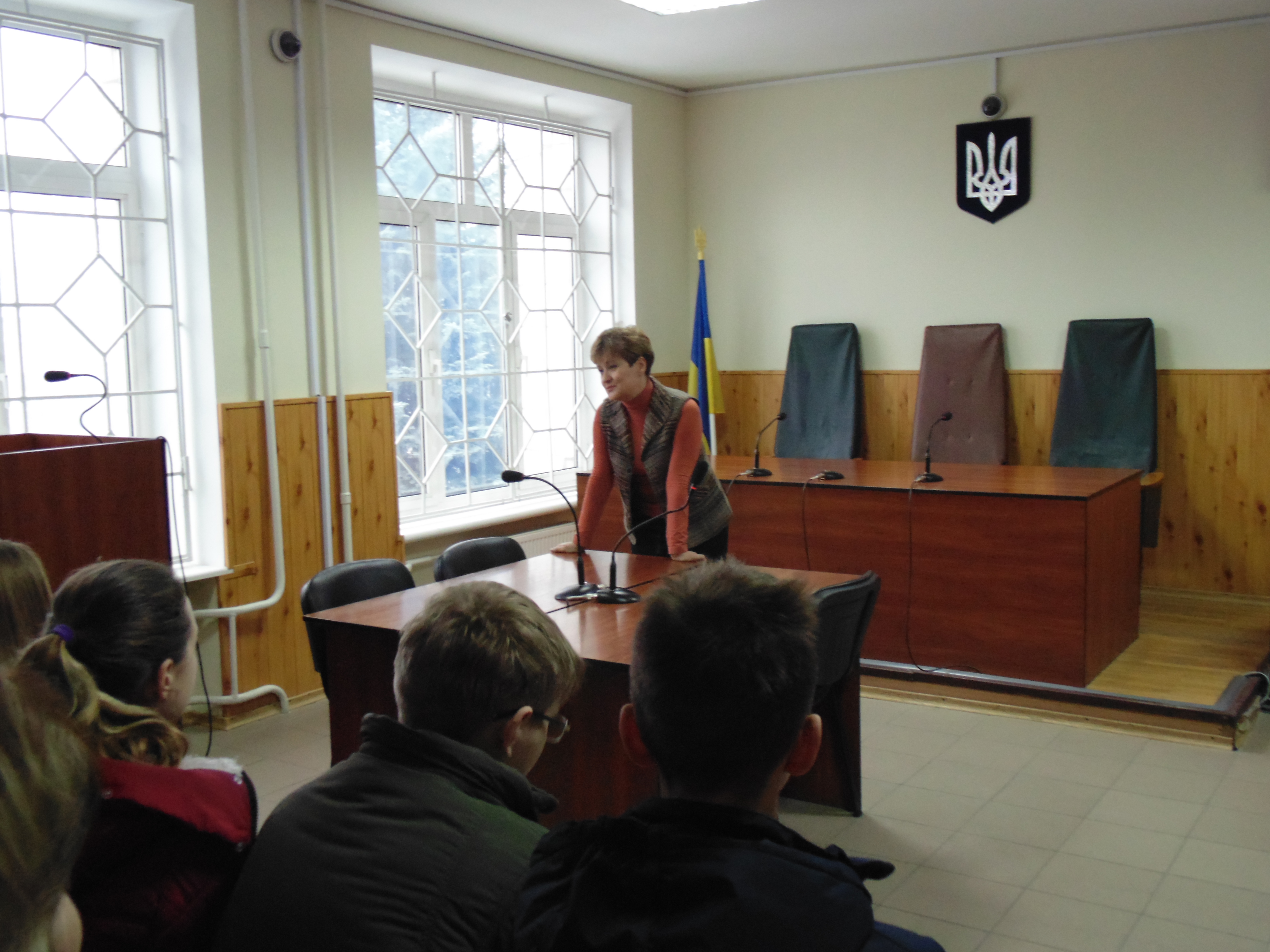 Потім юних відвідувачів запросили до зали судових засідань, де вони спілкувалися із керівником апарату суду Аллою Шевченко. У форматі відкритого діалогу разом із керівником апарату школярі з’ясували, які саме місця в залі судового засідання займають судді, прокурори, адвокати, секретар судового засідання, а також підозрюваний чи обвинувачений. Разом з’ясували, що до судді потрібно звертатися словами «Ваша честь», а усім присутнім у залі судового засідання потрібно вставати коли суддя заходить чи виходить із залу.
