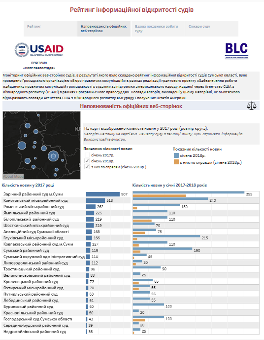 Лідером за кількісним наповненням сайту новинними матеріалами за підсумками 2017 року є Зарічний районний суд м. Суми (907), наступним у рейтингу іде Конотопський міськрайонний суд (518). У 2018 році усі суди також наповнювали новинні розділи подіями та оперативною інформацією.