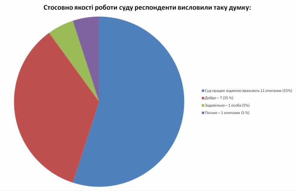 Підсумки анкетування свідчать, що респонденти в цілому задоволені організацією роботи суду, якістю та доступністю інформації для відвідувачів суду, умовами перебування у приміщенні суду.